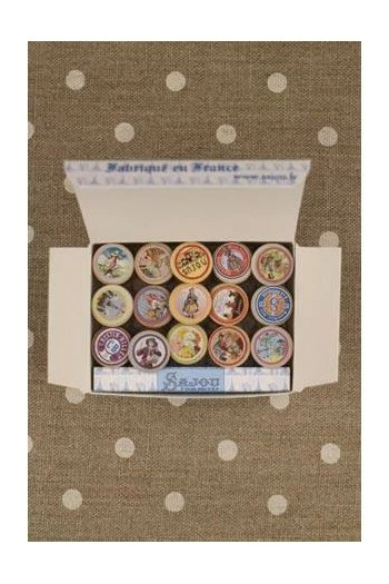 Petite boîte en carton Sajou contenant quinze bobines miniatures en bois étiquetées.