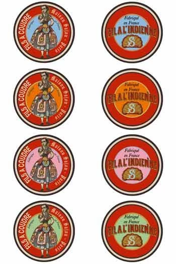 Réédition de quatre petites bobines en bois. Elles sont étiquetées Fil À l’Indienne.