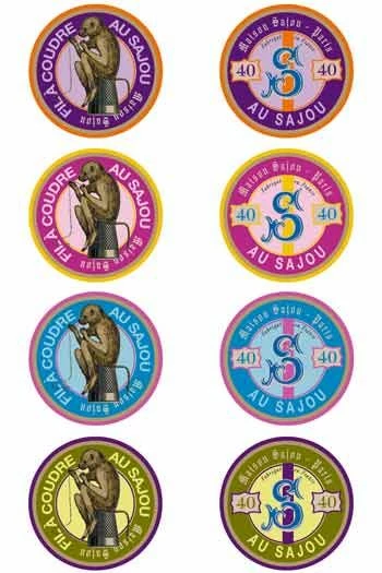 Réédition de quatre petites bobines en bois. Elles sont étiquetées Au Sajou. Le « Sajou » est aussi un petit singe.
