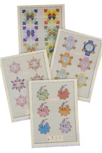 Cet album Sajou en accordéon à huit volets propose quatre séries de six cartes à fils Sajou à broder au point de croix :