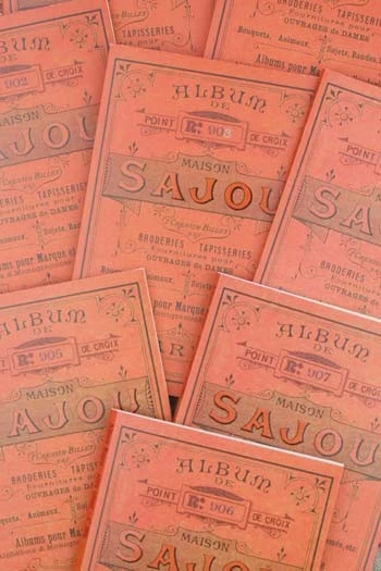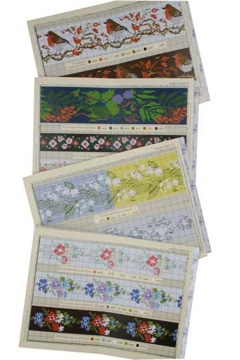 Cet album Sajou en accordéon à huit volets propose onze modèles de bordures à broder au point de croix :