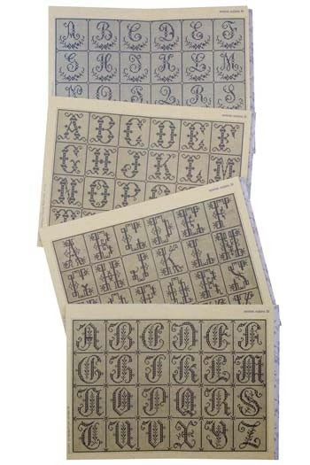 Ce dépliant de point de croix contient quatre alphabets chacun disposé sur une double page. Dans les alphabets anciens, le « I » et le « J » sont considérés comme la même lettre et le « W » se brodait en doublant le « V », c’est pourquoi ces abécédaires ne comportent que 24 lettres.