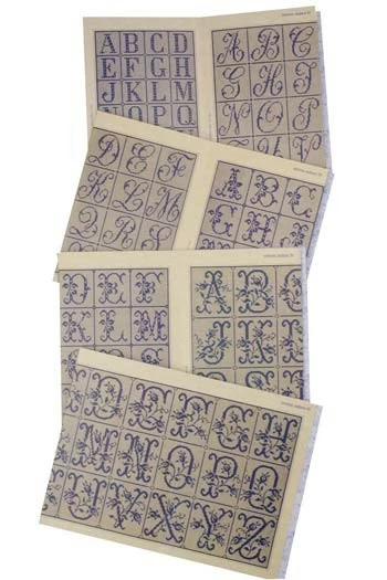 Ce dépliant de point croix comporte 4 alphabets, un disposé sur une page, deux sur deux doubles pages et un sur une triple page. Dans les alphabets anciens, le « I » et le « J » sont considérés comme la même lettre et le « W » se brodait en doublant le « V », c’est pourquoi ces abécédaires ne comportent que 24 lettres.
