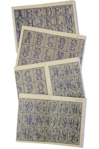 Ce dépliant de point croix comprend trois alphabets, un disposé sur une double page et deux disposés sur une triple page. Dans les alphabets anciens, le « I » et le « J » sont considérés comme la même lettre et le « W » se brodait en doublant le « V », c’est pourquoi ces abécédaires ne comportent que 24 lettres.