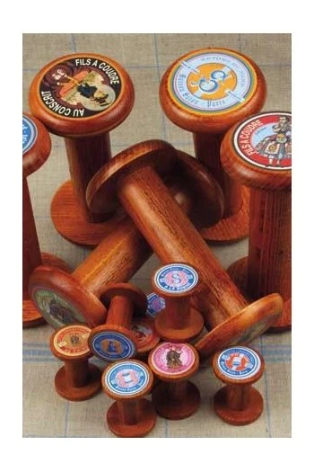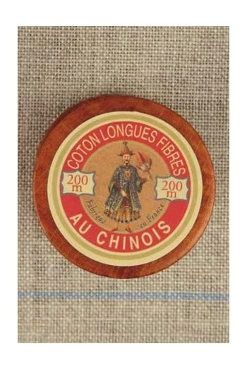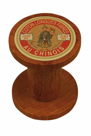 Jolie bobine en bois vernie à l’ancienne avec deux étiquettes Fil Au Chinois rouges.