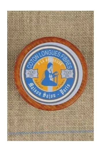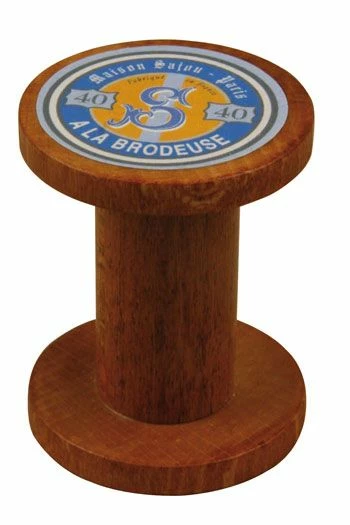 Jolie bobine en bois vernie à l’ancienne avec deux étiquettes Sajou oranges.