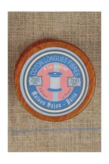 Jolie bobine en bois vernie à l’ancienne avec deux étiquettes Sajou roses.