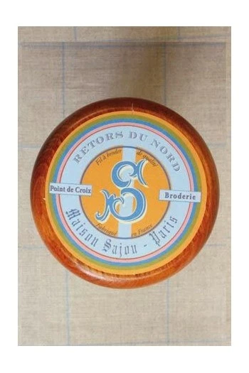 Grande bobine en bois Retors du Nord. Cette spectaculaire bobine est une réédition de bobines utilisées dans les usines pour le glaçage des fils. Elle mesure 18 cm de haut, le diamètre des joues est de 8 cm. En principe, ces bobines sont des modèles de travail et elles ne sont pas étiquetées. Mais nous n’avons pas résisté à les habiller avec de belles étiquettes : ici, l’étiquette de notre fil à broder Retors du Nord.