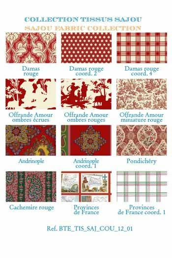 Notre tissu Damas rouge et ses coordonnés 2 et 4, nos deux toiles de Jouy ombres chinoises, notre toile de Jouy miniature rouge, notre tissu Andrinople et son coordonné , notre tissu Pondichéry, notre tissu Cachemire rouge, notre tissu Provinces de France et son coordonné.