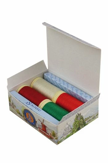 Voyez la boîte de quatre bobines de fil à coudre que nous proposons pour coudre ces tissus.