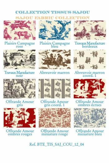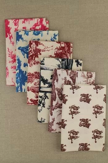 Grande boîte contenant 12 coupons d’une sélection de nos toiles de Jouy : Les Plaisirs de la Campagne en rose et en bleu, les Travaux de la Manufacture en bordeaux et en noir, l’Abreuvoir marron et son coordonné, l’Offrande à l’Amour gris et son coordonné, nos deux toiles de Jouy ombres chinoises, nos deux toiles de Jouy miniatures en rouge et en bleu.