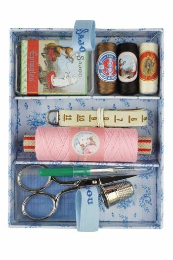 Notre boîte à couture Chien et chat est un peu plus « technique » que le modèle Petites Filles Sajou. En effet, elle contient en plus une fusette de fil à bâtir et une craie de couturière mais moins de cocons de fil à coudre.