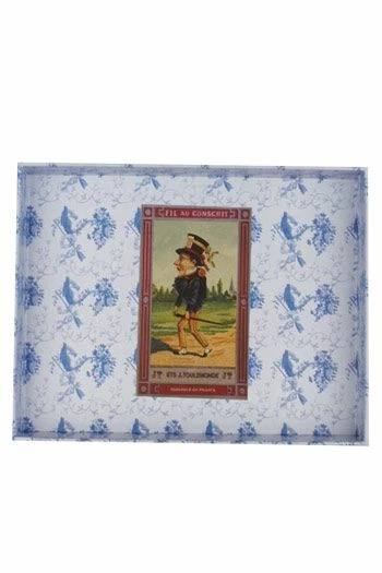 Cette boîte est composée de deux plateaux, celui du dessus étant amovible et pourvu, de chaque côté, de deux petits rubans Sajou facilitant la préhension. Elle est recouverte d’un de nos papiers bleu et blanc, le motif des plateaux pouvant être différent. Le couvercle est, à l’extérieur, revêtu de l’étiquette des Petites Filles Sajou brodant, l’intérieur est décoré d’une étiquette rectangulaire Fil Au Conscrit.