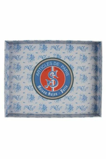 Cette boîte est composée de deux plateaux, celui du dessus étant amovible et pourvu, de chaque côté, de deux petits rubans Sajou facilitant la préhension. Elle est entièrement recouverte d’un de nos papiers bleu et blanc, le motif des plateaux pouvant être différent. Le couvercle est, à l’extérieur, revêtu d’une étiquette représentant une vue panoramique de Paris avec les principaux monuments de la capitale, l’intérieur est décoré d’une étiquette ronde Articles de Paris.