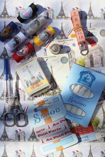 Cette boîte à couture contient une sélection de nos produits sur le thème de Paris et de la tour Eiffel.
