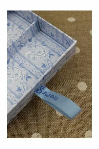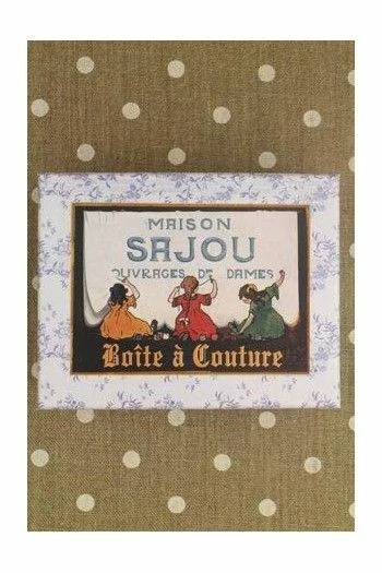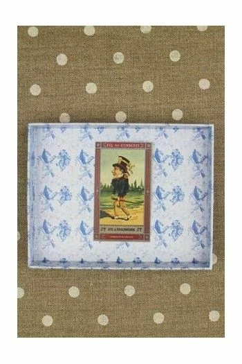 Elle est recouverte d’un de nos papiers bleu et blanc, le motif des plateaux pouvant être différent. Son couvercle est, à l’extérieur, revêtu d’une étiquette représentant les Petites Filles Sajou brodant, l’intérieur est décoré d’une étiquette rectangulaire Fil Au Conscrit.