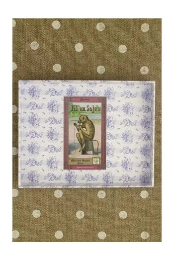 Elle est recouverte d’un de nos papiers bleu et blanc, le motif des plateaux pouvant être différent. Son couvercle est, à l’extérieur, revêtu d’une étiquette représentant huit médaillons de costumes traditionnels français, l’intérieur est décoré d’une étiquette rectangulaire Fil Au Sajou.