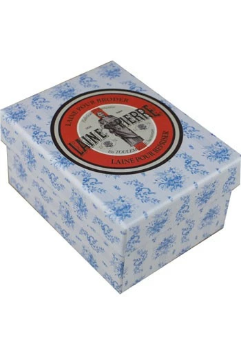 Elle est revêtue d’une étiquette ronde Laine Saint Pierre de 7,3 cm de diamètre et est imprimée de l’un de nos motifs Sajou floral bleu. L’intérieur est recouvert du même papier.