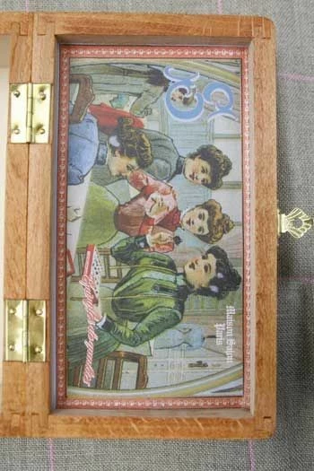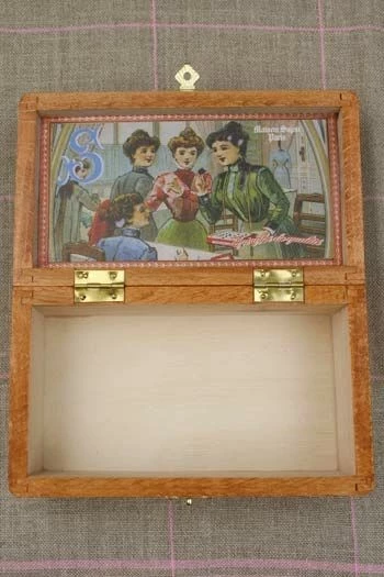 Cette boîte est dans l’esprit de celle que l’on trouvait autrefois dans les catalogues de vente comme ceux du Bon Marché ou de la Samaritaine. À l’époque, en effet, les ménagères et les couturières achetaient certaines fournitures en grande quantité, proposées dans de telles boîtes.