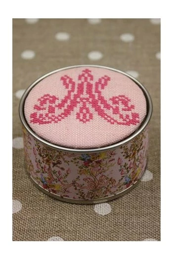 Cette boîte ronde est fournie avec une étiquette reproduisant une interprétation au point de croix du tissu de la Chambre de la Reine Marie Antoinette au château de Versailles.