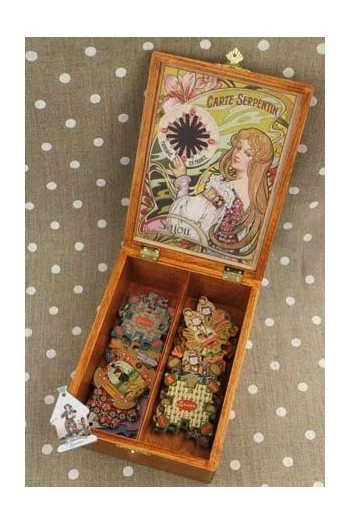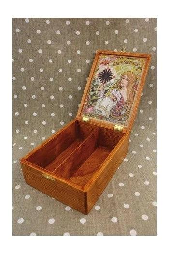 Une grande étiquette de carte à fil ancienne Carte Serpentin, inspirée d’une boîte ancienne, décore le dessus du couvercle, ainsi que son intérieur. Le corps et le cadre du couvercle de cette boîte sont faits en bois d’aulne, le dessus du couvercle est en contreplaqué de bouleau. Elle se ferme au moyen d’un petit fermoir en métal.