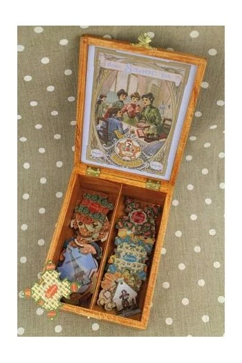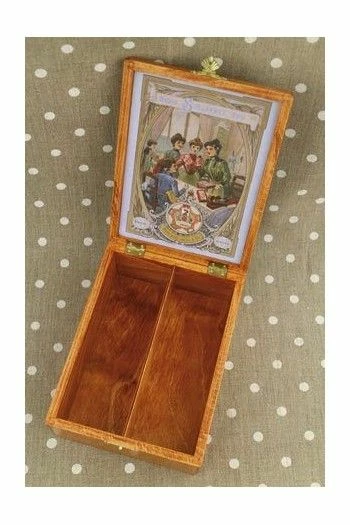 Une grande étiquette représentant des dames dans un salon de couture, inspirée d’une boîte ancienne, décore le dessus du couvercle, ainsi que son intérieur. Le corps et le cadre du couvercle de cette boîte sont faits en bois d’aulne, le dessus du couvercle est en contreplaqué de bouleau. Elle se ferme au moyen d’un petit fermoir en métal.