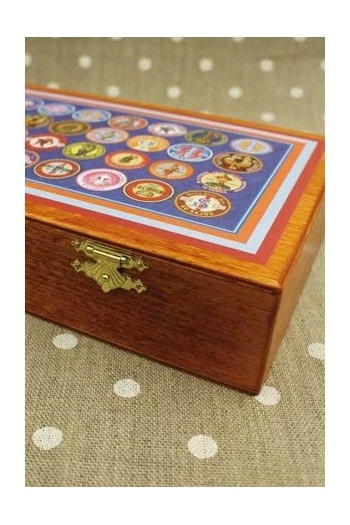 Une grande étiquette sur fond bleu reprenant de nombreux modèles de nos étiquettes décore le dessus du couvercle, ainsi que son intérieur. Le corps et le cadre du couvercle de cette boîte sont faits en bois d’aulne, le dessus du couvercle est en contreplaqué de bouleau. Elle se ferme au moyen de deux petits fermoirs en métal.