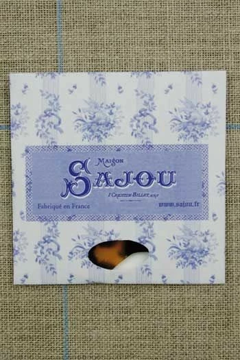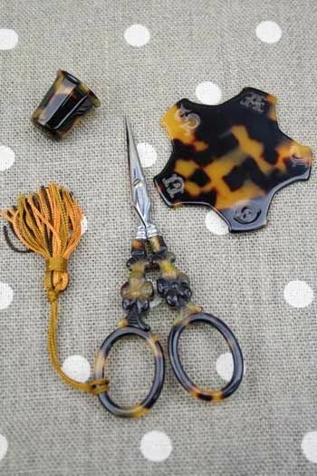 Cette carte à fil, qui est assortie aux ciseaux et au dé de couturière façon écaille, ressemble à celles que l’on trouvait dans les jolis nécessaires à couture d’autrefois.