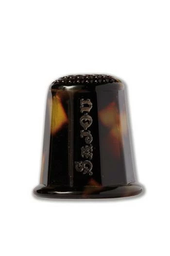 Nécessaire de couture à l’ancienne comprenant une paire de ciseaux façon écaille motif fleur, un dé à coudre façon écaille et une carte à fil assortie.