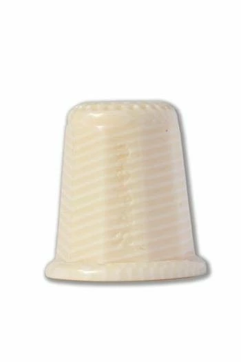 Nécessaire de couture à l’ancienne comprenant une paire de ciseaux façon ivoire veiné motif S, un dé à coudre façon ivoire et une carte à fil assortie.