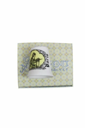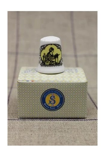 Dé de collection en porcelaine fine et très blanche, dite « fine bone china ». Il est décoré du célèbre motif de la Brodeuse Sajou, sur un fond jaune.