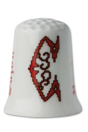 Dé à coudre décoré de l’initiale C en rouge, semblant avoir été brodée au point de croix.