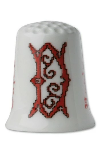 Dé à coudre décoré de l’initiale D en rouge, semblant avoir été brodée au point de croix.