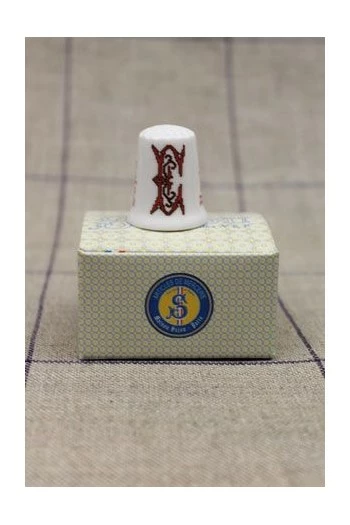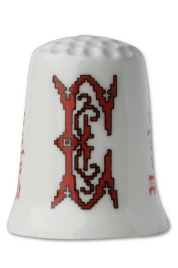 Dé à coudre décoré de l’initiale E en rouge, semblant avoir été brodée au point de croix.