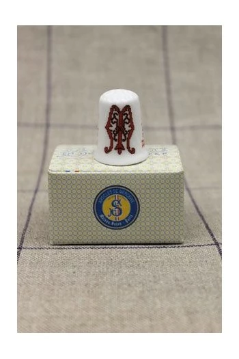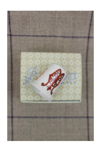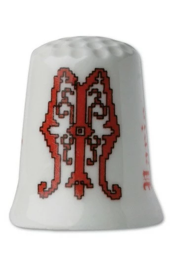 Dé à coudre décoré de l’initiale M en rouge, semblant avoir été brodée au point de croix.