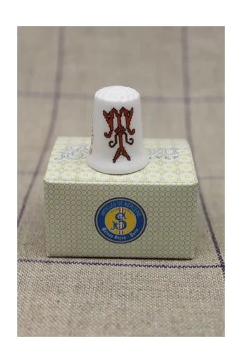 Dé à coudre décoré de l’initiale T en rouge, semblant avoir été brodée au point de croix.