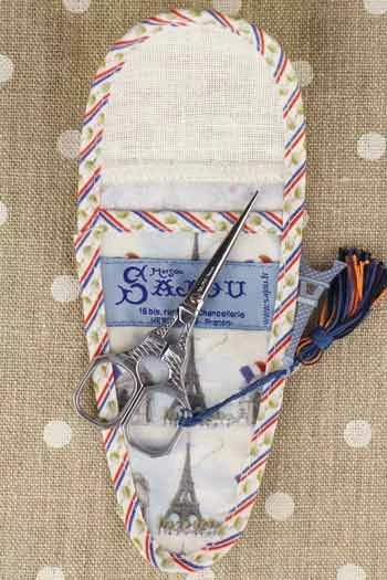 Cet étui moyen convient pour tous nos ciseaux à broder. Il est fait dans notre tissu Ma Belle Ville de Paris (coordonné 1) que nous avons fait enduire en mat, et bordé d’un biais qui lui est assorti. Son rabat est en lin 12 fils blanc cassé, permettant de broder une initiale ou un petit motif.