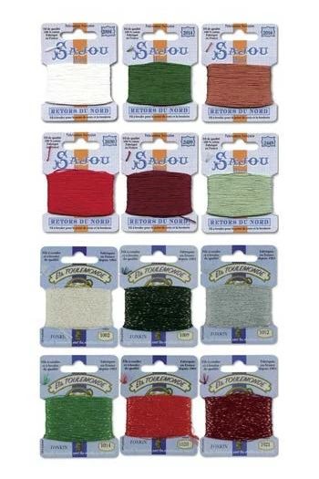 – six cartes de fil à broder coton Retors du Nord, mi-blanc (2004), jardin (2014), fauvette (2016) rouge (2030), bordeaux (2409) et nil (2449) ;