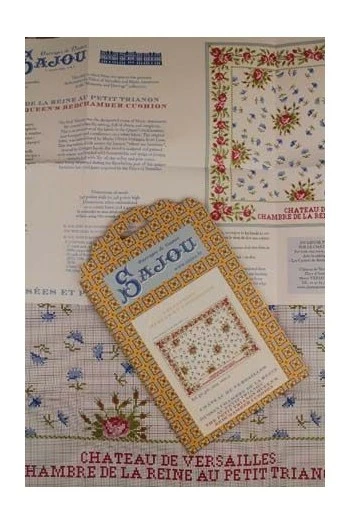 Nous vous proposons ici une grille permettant de réaliser un grand coussin reprenant le motif central et les bordures de ce charmant tissu. Cette fiche est dérivée de notre spectaculaire ouvrage consacré à Marie-Antoinette. Les deux grandes broderies évoquant le château de Versailles et Marie-Antoinette constituent le sixième opus de cette collection Musées et Patrimoine. Cette grille en couleurs est imprimée sur deux grands feuilles de format 60 x 28 cm, avec toutes les explications nécessaires. Elles sont présentées pliées dans une pochette Sajou.