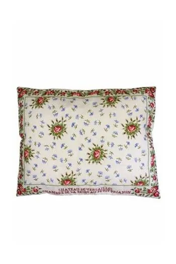 Le Petit Trianon était le domaine réservé de Marie-Antoinette. Elle y créa un décor bucolique fait de charme et d’une simplicité qui n’est qu’apparente. Tout y est recherché et d’un raffinement extrême. Ici, une évocation du tissu de la chambre à coucher de la reine : un décor bouquets de roses et de barbeaux (petits bleuets des champs) sur du basin blanc. Le tissu d’origine avec été brodé par Marie-Olivier Defarges, de Lyon. Cette merveilleuse étoffe garnit un mobilier, qui ne l’est pas moins, le célèbre « mobilier aux épis » créé par Georges Jacob : les bois sont sculptés et peints au naturel d’épis tressés de chèvrefeuilles et de brins de jasmin, ornés de muguet et de pommes de pin. Dispersé à la Révolution, une partie de cet extraordinaire mobilier a, depuis, pu être acquis par le château de Versailles. Ce coussin est dérivé de nos deux grandes grilles consacrées à Marie-Antoinette et au château de Versailles, dans la Collection Musées et Patrimoine.