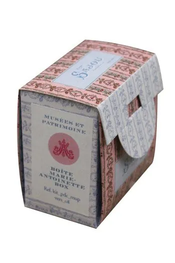 – une boîte ronde avec son couvercle et une étiquette d’habillage. Celle-ci est une représentation au point de croix du tissu de la Chambre de la Reine ;