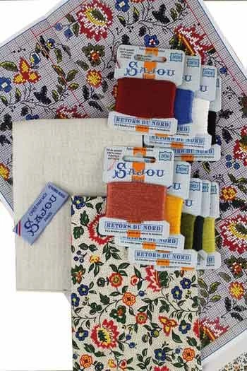 – 9 cartes de fil à broder Retors du Nord coloris : 2004, 2005, 2016, 2023, 2028, 2034, 2038, 2749 et 2876 ;