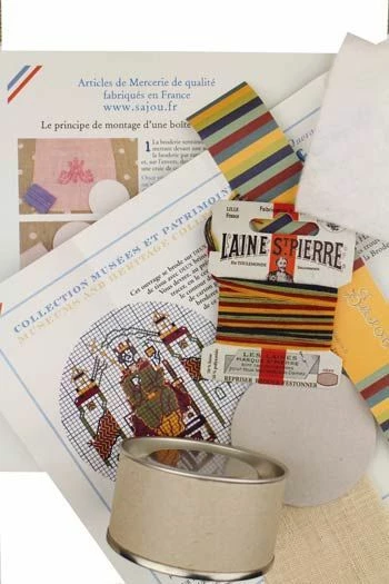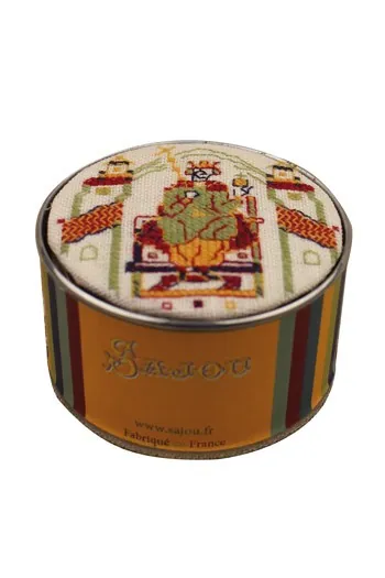 Cette boîte à broder représentant le couronnement d’Harold est dérivée de la grande grille de point de croix qui évoque la formidable histoire racontée par la Tapisserie de Bayeux. La broderie se réalise au point de croix sur deux fils du tissu avec deux brins de Laine Saint-Pierre. C’est un ouvrage facile et amusant qui peut convenir à des débutantes.