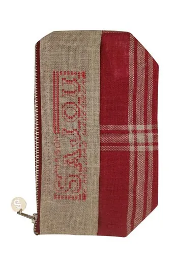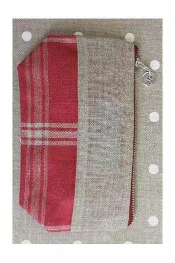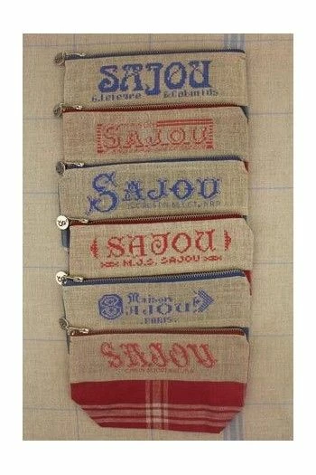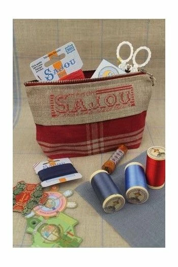 Petite trousse en lin à carreaux, à broder au point de croix. Le nom Sajou tel qu’il est ici représenté est une interprétation du logo Sajou tel qu’il figure sur les albums de tapisserie beiges.