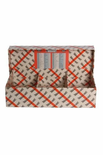 Elle est entièrement recouverte de papier Laine Saint-Pierre. À l’intérieur, deux séparations permettent de loger les cartes sur trois rangées. Le couvercle est décoré d’une étiquette ronde Laine Saint-Pierre (15,5 cm de diamètre).