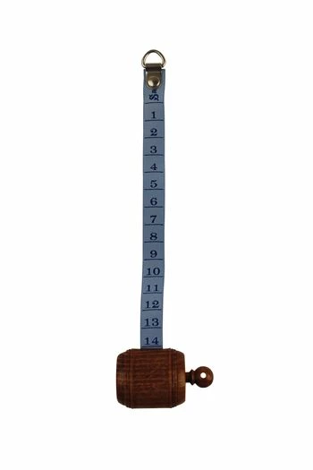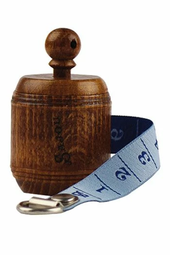 Réédition d’un petit mètre de couturière à l’ancienne en bois, teinté couleur merisier. Le mètre ruban se déroule lorsqu’on tire sur l’anneau, et il se rembobine au moyen de la petite molette située sur le dessus, qu’il suffit de tourner. Le ruban dont est pourvu ce mètre est bleu, et a été spécialement tissé pour Sajou. Le corps du mètre ressemble à un petit tonneau. Son diamètre à la base est de 2,5 cm. Il mesure 3,6 cm de haut, molette non comprise. Il est marqué Sajou en noir.