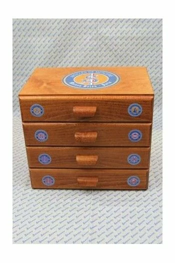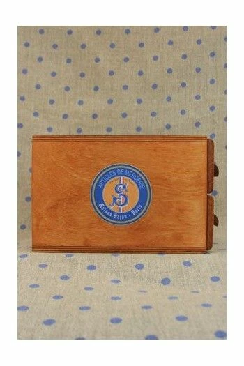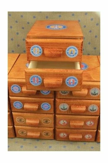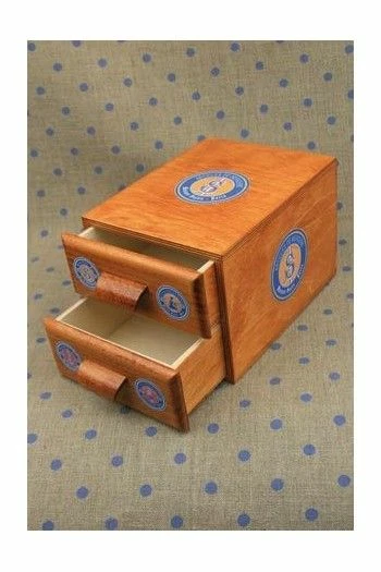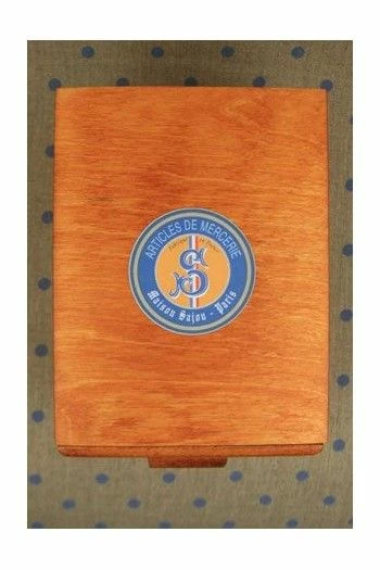 Petit meuble en bois décoré sur le dessus et chacun des côtés d’une étiquette ronde Sajou Articles de Mercerie.