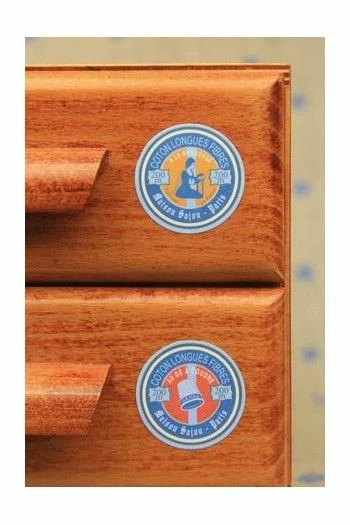 Chacun de ses deux tiroirs est décoré de deux petites étiquettes rondes différentes dans les tons oranges et dans les tons rouges. Il est en bois de peuplier et en bois de bouleau.