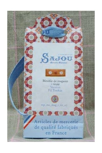 Ce meuble en bois à 1 tiroir est la réduction à l’échelle 1/12e de ceux qui sont présents dans notre boutique Sajou à Paris. Ici la version étiquette fil à broder Tonkin.