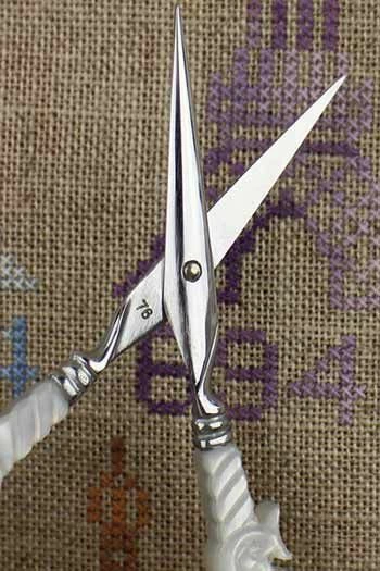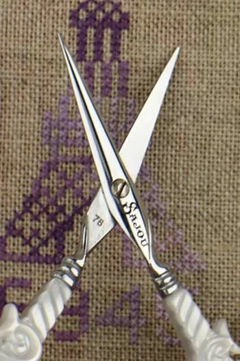 Cette paire de ciseaux de broderie représente le « S » de Sajou. Notez aussi le joli motif de feston autour des anneaux. Ses branches imitent la nacre, un matériau de l’on utilisait beaucoup autrefois pour fabriquer de délicats objets de couture. Le pompon de cette paire de ciseaux comprend un petit médaillon évidé d’un « S » de même matière que les ciseaux.
